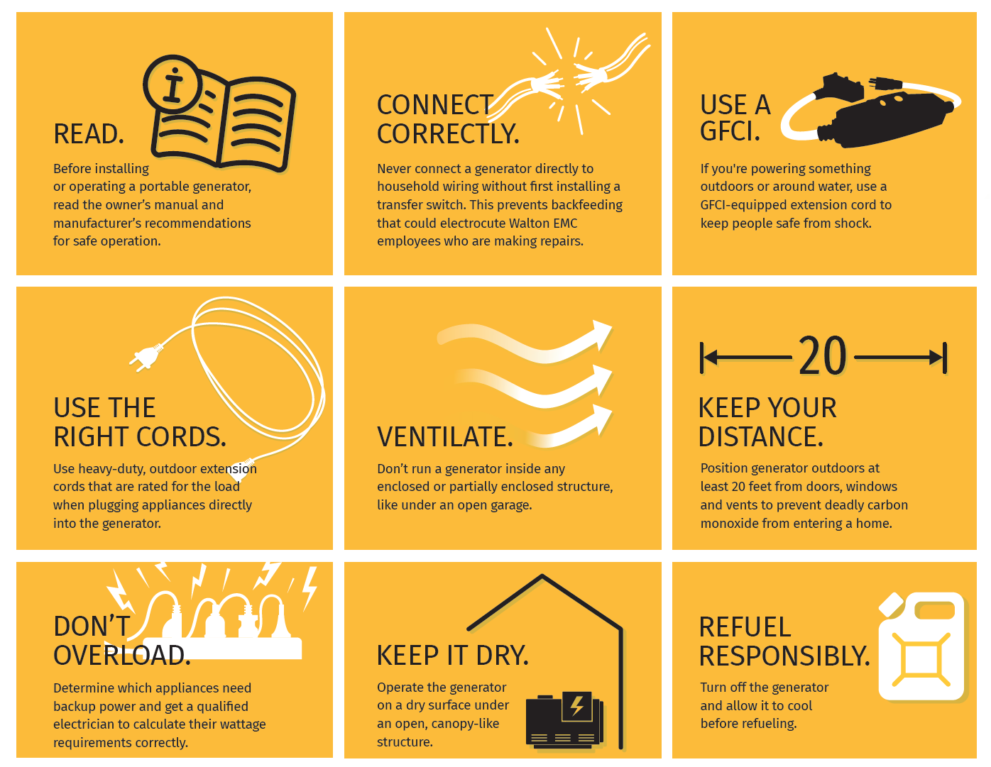 This information is posted in the interest of the safety of our members and employees. Walton EMC is not responsible for any damage or injury resulting from or omitted from these generator safety tips.