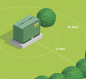 Just as our overhead lines need clearance, so do our underground facilities. Keep shrubs at least ten feet from the sides and backs of our underground transformers; don’t plant anything directly in front. It hampers our crews making outage repairs if they have to first trim shrubs to gain access to our equipment. It also wastes your money to plant nice shrubs just to have them cut down when we’re restoring your power.