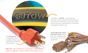 A: The National Electric Code specifies characteristics for extension cords that are required to be printed approximately every foot along the wire: